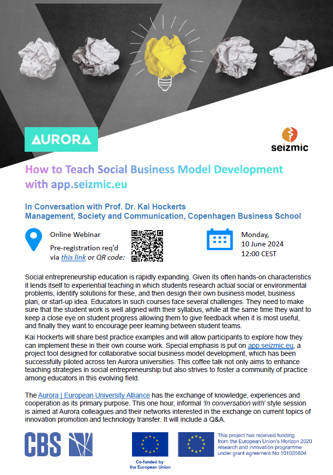 Prof. Dr. Kai Hockerts, Copenhagen Business School, will present his and his team's work on the app.seizmic.eu, a project tool designed for collaborative social business model development, which has been successfully piloted across ten Aurora universities.