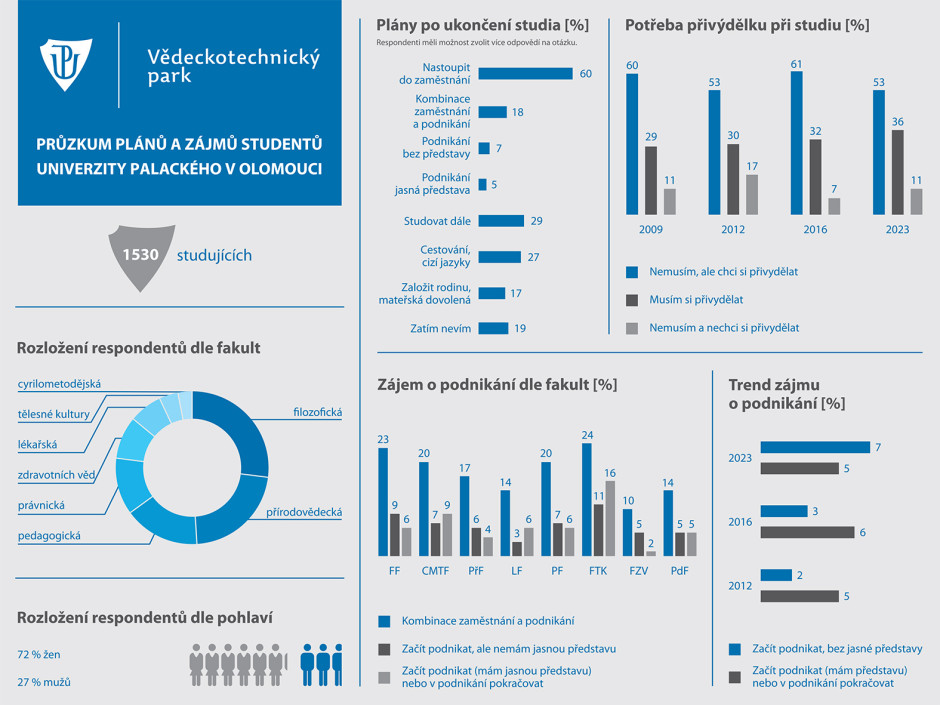 Průzkum kariérních plánů a zájmu studentů UP zrealizoval Vědeckotechnický park Univerzity Palackého (VTP UP), jehož rolí je mimo jiné podněcovat podnikavost mezi studenty a pomáhat proměňovat jejich podnikatelské nápady do praxe. Cílem šetření bylo zjistit povědomí, přání a požadavky směrem k VTP UP.