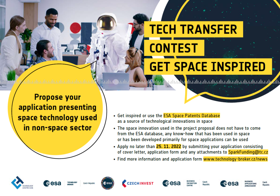Přihlášky zasílejte na SparkFunding@tc.cz do 25.11.2022. Výherci budou vyhlášeni 29.11.2022 během Space2Business v rámci Czech Space Week 2022.