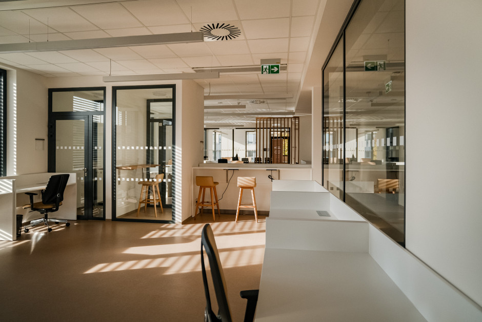 Blok C nabízí nejen 26 kanceláří o velikosti 18 – 25 m2, ale také 22 laboratoří a halu drobné výroby o ploše 162m2. Výhodou jsou krásné terasy ve společných prostorech i kancelářích.