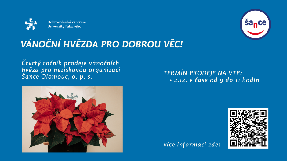 K Vánocům patří dobré skutky. Spojili jsme proto síly s Dobrovolnickým centrem Univerzity Palackého a během snídaně si budete moci zakoupit vánoční hvězdu pro dobrou věc. Celkový výtěžek z každé zakoupené hvězdy poputuje do neziskové organizace Šance, která již 30 let pomáhá hemato-onkologickým pacientům a jejich rodinám, ale i dětem se závažným dlouhodobým onemocněním. Hvězdy budeme prodávat ve dvou velikostech, malá za 60 Kč a velká za 120 Kč. Platba pouze v hotovosti (uvítáme přesnou částku).