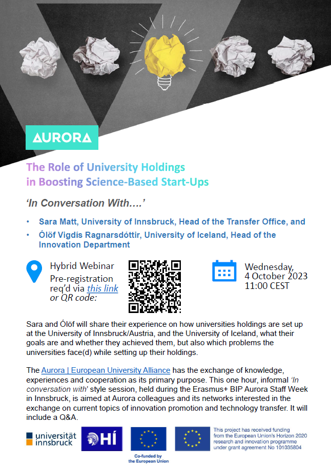 The Aurora European University Alliance has the exchange of knowledge, experiences and cooperation as its primary purpose. This one hour, informal ‘In conversation with’ style session, held as hybrid webinar during the Erasmus+ BIP Aurora Staff Week in Innsbruck, is aimed at Aurora colleagues and its networks interested in the exchange on current topics of innovation promotion and technology transfer. It will include a Q&A.